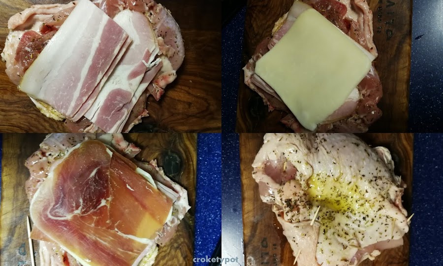 Sobre uno de los muslos ponemos el bacon, luego el queso y luego el jamón, tapamos con el otro muslo y les ponemos palillos de madera para que queden bien cerrados.