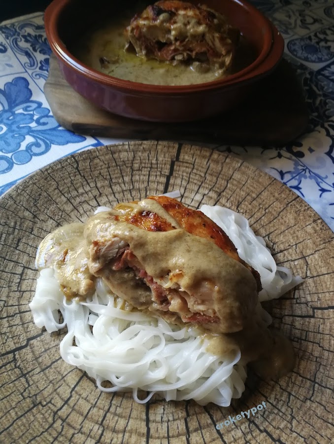 El pollo en la slow coocker es una carne muy agradecida, con pocos ingredientes nos queda un plato muy agradecido. Hoy hemos hecho muslos de pollo deshuesados que en lugar de hacerlos en rollito los hemos hecho uno sobre otro más estilo "cachopo"cocinado con setas y cebollitas de guarnición, y acompañado con noodles de arroz, pero podemos ponerle arroz cocido, pasta o patatas fritas, os aseguro que es un comodín y según lo acompañes es un plato diferente.