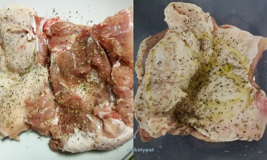 ELABORACIÓN: Con antelación, mínimo 3 horas, aliñamos los muslos de pollo con hierbas provenzales, un poco de aceite AOVE, no le ponemos sal.
