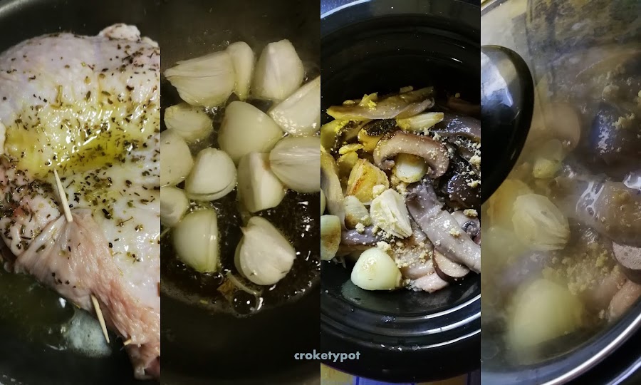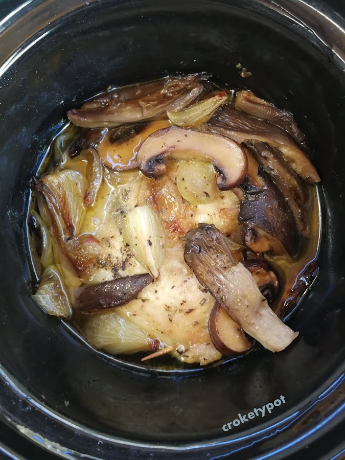 En una sartén marcamos por los dos lados los muslos, los pasamos a la olla lenta, en la sartén sin quitar el aceite y los jugos, salteamos las cebollas, y las pasamos a la olla. Por ultimo salteamos las setas y todo a la olla. tapamos y lo dejamos 3 horas en alta.