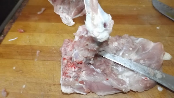 1. Deshuesamos los muslos o a vuestro carnicero de confianza si os lo hace perfecto, aunque si os digo la verdad no es muy complicado en donde llevando un cuchillo tipo puntilla la unica tactica a llevar es llevarlo por el hueso por la parte interior del muslo simplemente. Con los huesos que nos ha quedado haremos un caldo
