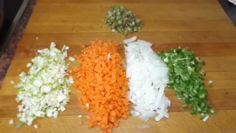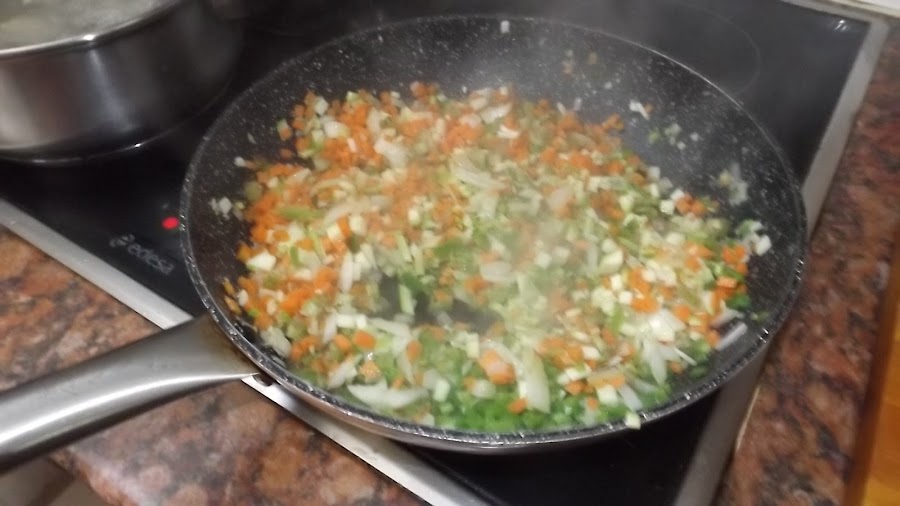 2. Cortamos finamente a cuadros toda la verdura del relleno y salteamos hasta ablandar en aceite de oliva. Salpimentamos y reservamos el relleno.