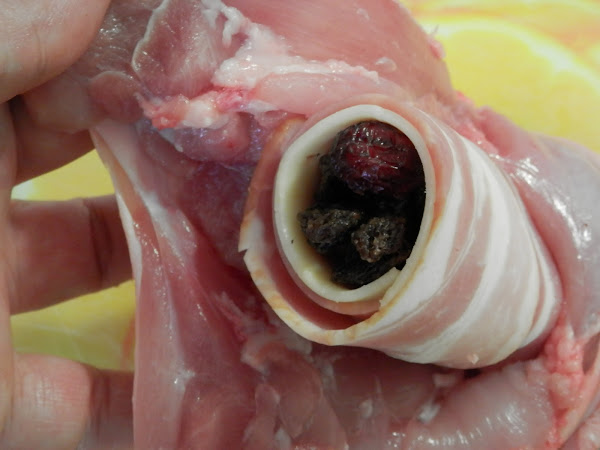 ¿Tenemos los muslos ya? Bueno, pues vamos a comenzar con el relleno. Para esta variedad de relleno, he puesto bacon queso y arándanos con pasas, podéis poner nueces,orejones, pistachos, almendras o lo que más os guste.