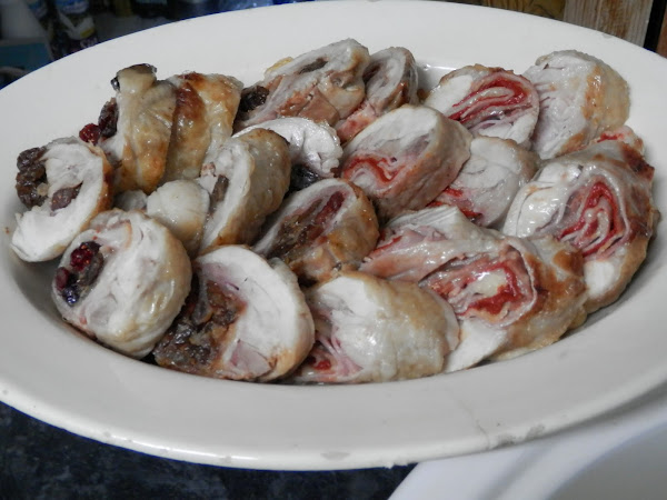 Forma un canutillo con ellas de manera que el bacon enrolle por completo el resto de relleno. (Si se te salen las pasas y los arándanos, cuando hagas el canutillo, mételos dentro)