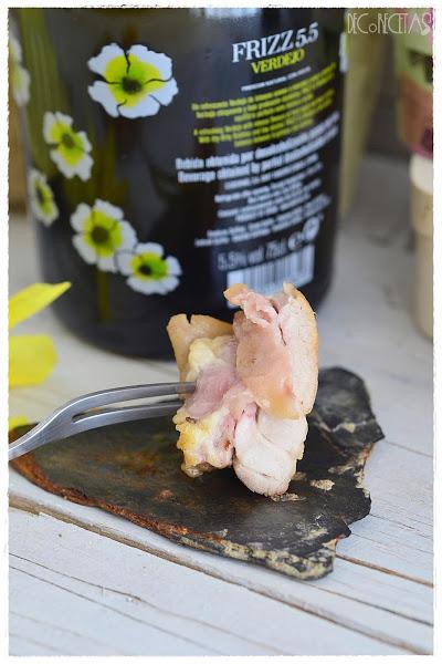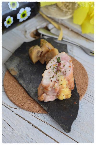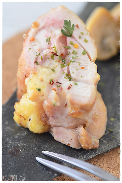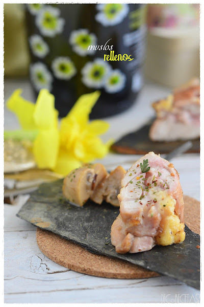 En esta ocasión, con la parte de muslos y contramuslos que me sobraban, ya que el resto del pollo lo hice en escabeche (receta aquí), los deshuesé y rellené haciéndolos en una salsa de vino espumoso blanco y unos champiñones