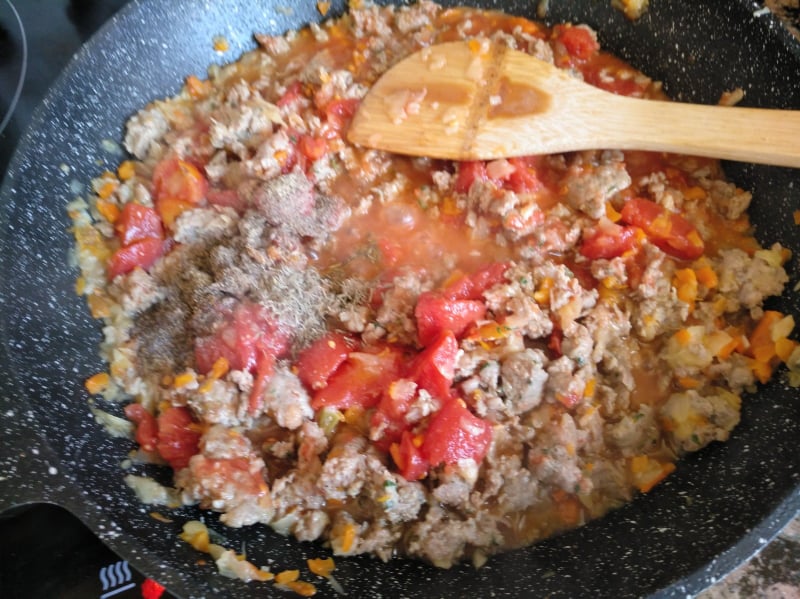 Cuando esté sellada, añadimos el tomate, las especias y la pastilla de avecrem.