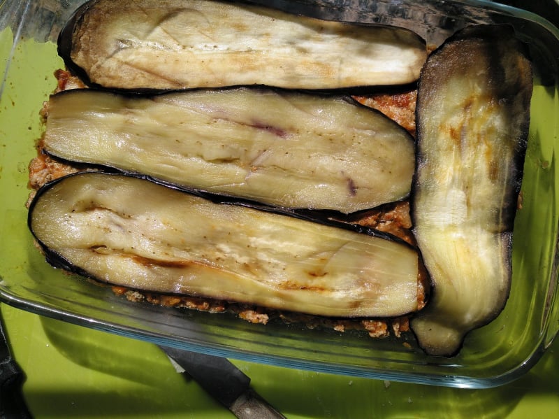 Después, colocamos la mitad de la carne, después, otra capa de berenjenas, otra de carne y, finalmente, una de berenjenas.