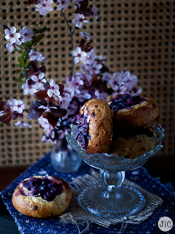 Ya sabéis que me encanta la tarta de queso o cheesecake por eso he querido añadir un toque de crema de queso a estos bollitos, rellenándolos con ella aparte de con arándanos. Creo que el resultado es muy bueno y os va a encantar, pero vosotros en casa podéis hacerlos con o sin crema de queso (en tal caso, añadir más arándanos). No he probado a hacerlos con otros frutos rojos, pero seguro que están de fábula.