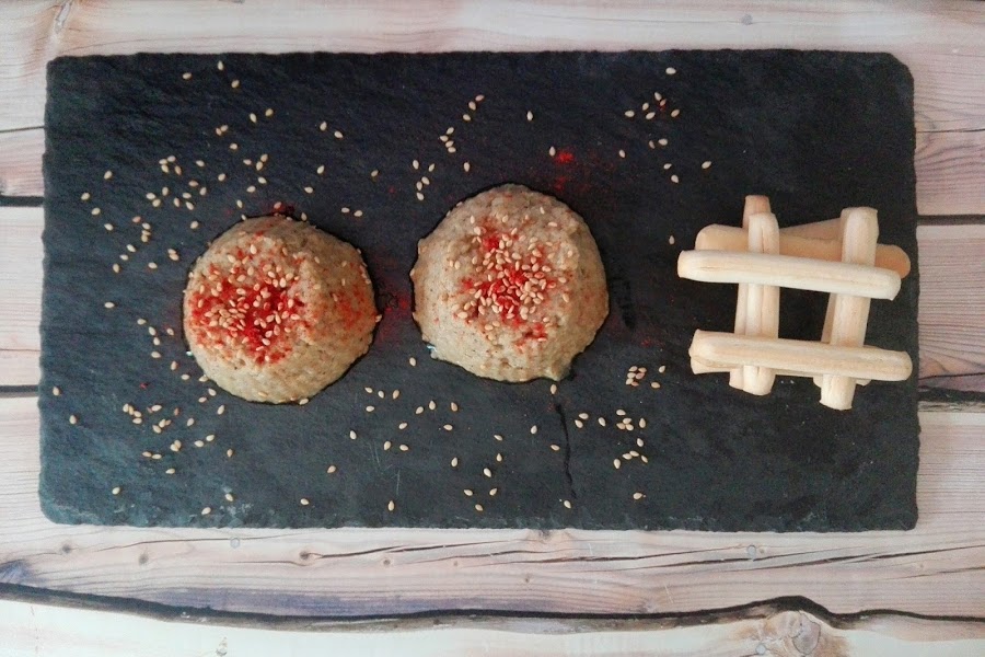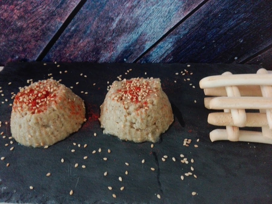 Para la presentación me inspiré en un local de Madrid donde nos presentaron el hummus de manera parecida. Utilicé unos moldes de silicona de cupcakes y luego espolvoree un poco de pimentón y semillas de sésamo por encima.