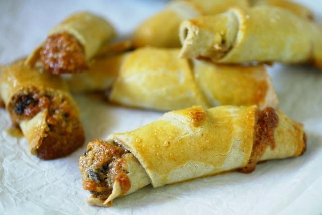 Colocar 1 cucharadita de relleno en el extremo ancho de cada triángulo y extenderlo uniformemente, dejando alrededor de 1/4 de pulgada alrededor de la orilla. Enrollar al estilo de croissant. Poner en la bandeja para horno ya engrasada, dejando 1 pulgada entre las galletas.