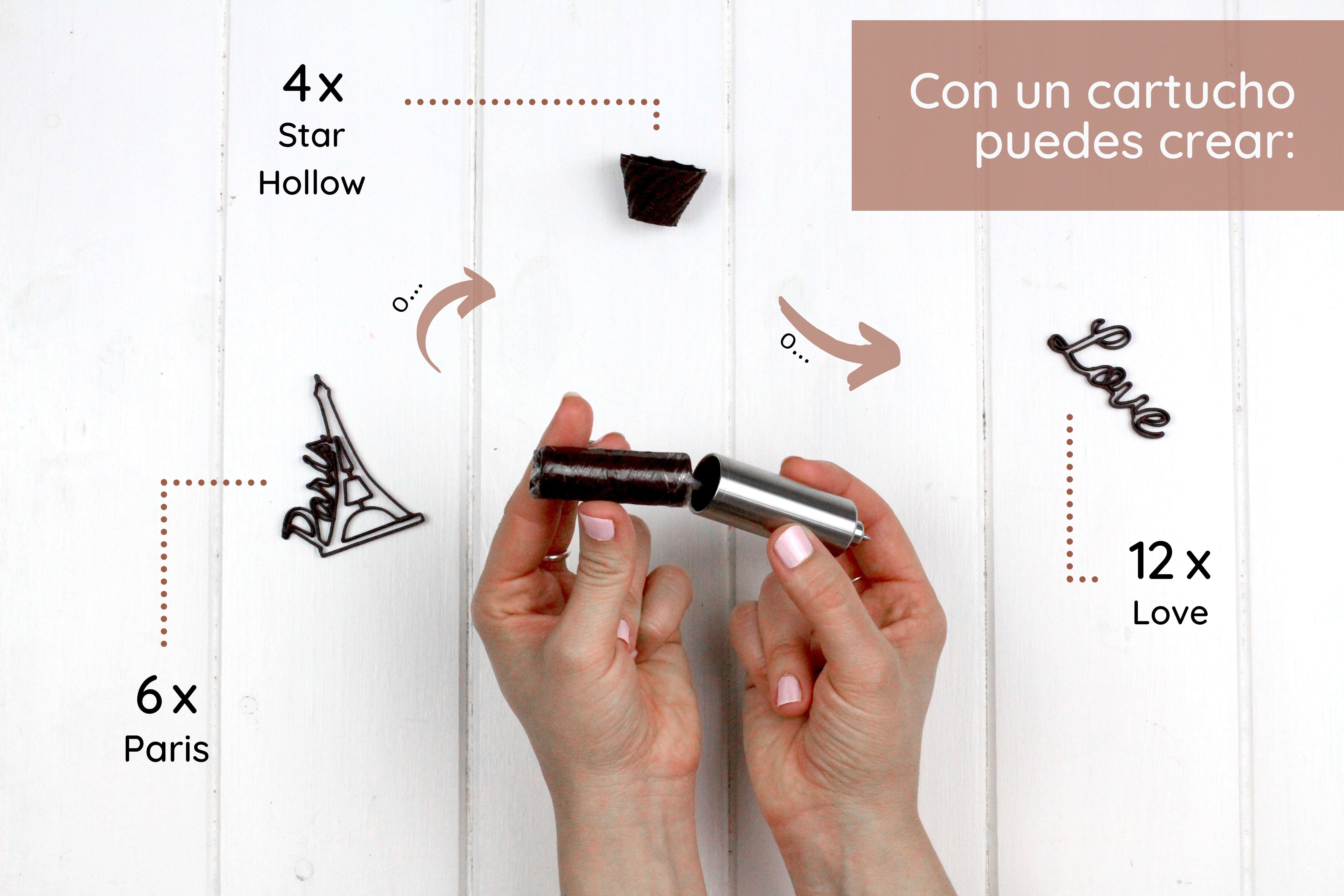 El chocolate que usa son como unas especie de barritas, las cuales se calientan en la impresora e imprimen en forma de hilo.Comprando la impresora incluye un paquetito de chocolate con un toque a vainilla de 5 tubitos, que equivale a 10 rellenos.