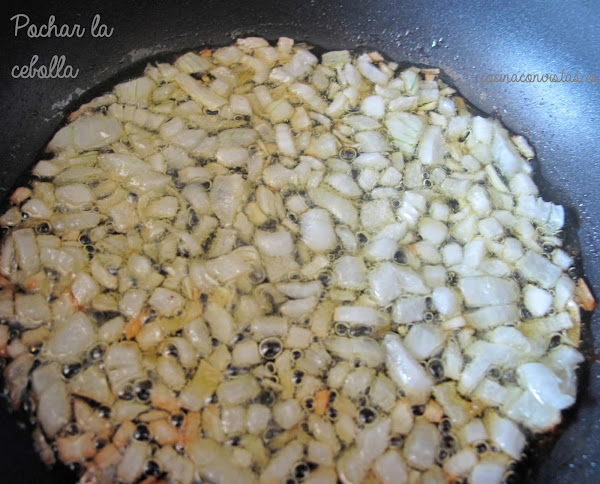 En una sartén ponemos 2 c.s de aove y ahí pochamos la ½ cebolleta muy picadita.