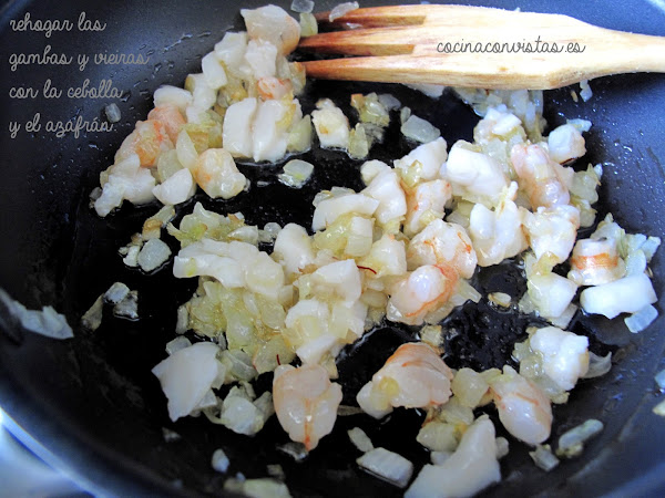 seguimos cocinando, cuando la cebolla esté blandita añadimos las gambas y vieiras picadas, damos un par de vueltas y le incorporamos el vino oloroso, seguidamente añadimos las algas y dejamos que vaya reduciendo.Salsa de Coral: