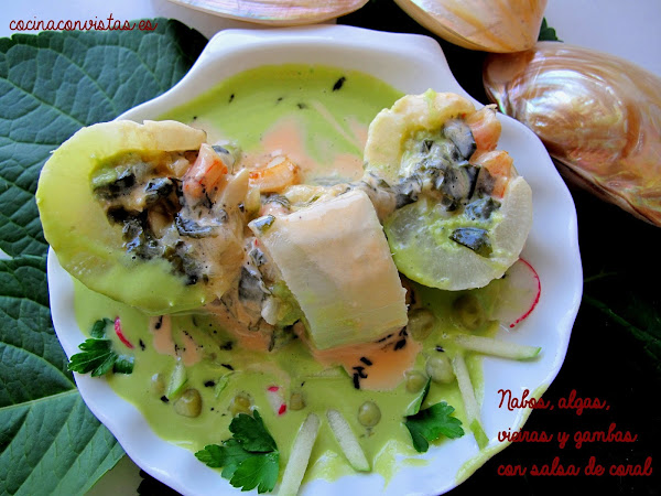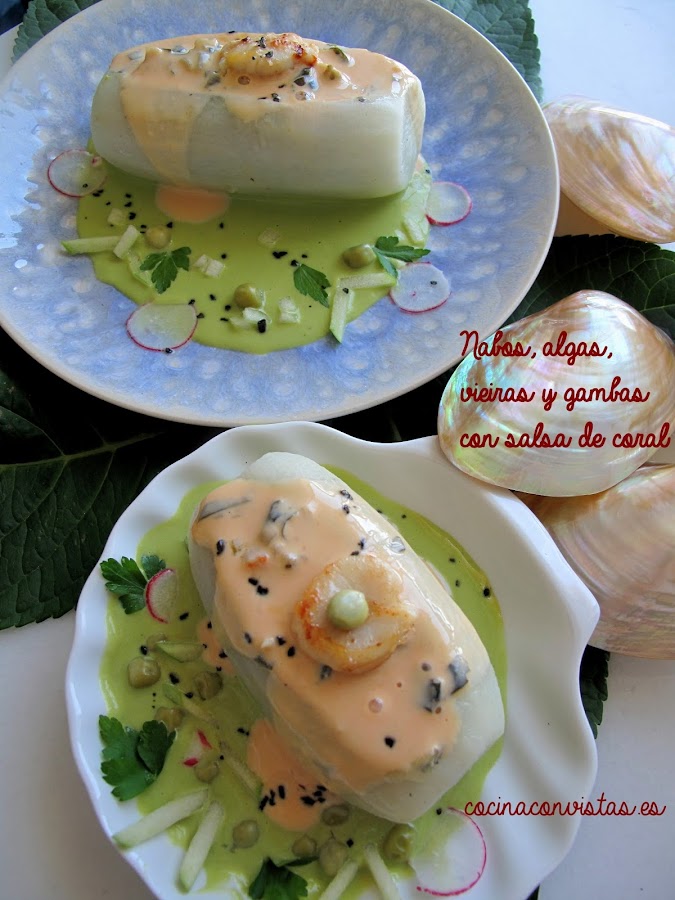 NABOS, ALGAS, VIEIRAS Y GAMBAS CON SALSA DE CORAL,