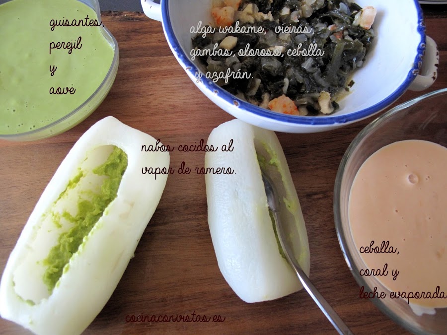 Rellenamos los nabos poniendo primero un poquito de lo que quedó en el colador de la crema de guisantes. Añadimos el relleno de algas con vieiras y gambas y reservamos. (los podemos calentar al microondas al momento de servir)