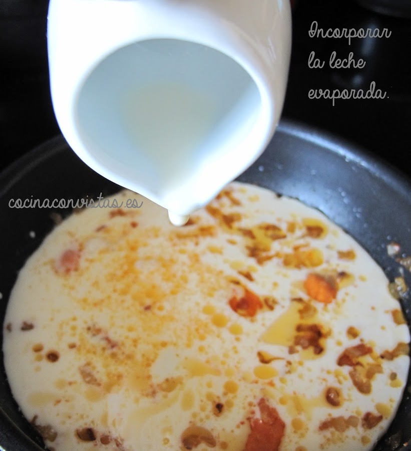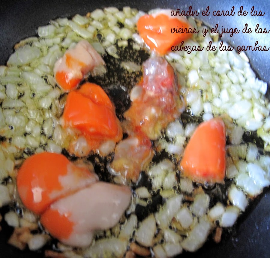 En una sartén ponemos 1 c.s de aove, echamos la ½ cebolleta tierna muy picadita y dejamos que se dore ligeramente, añadimos el coral de las vieiras picado y el interior de las cabezas de las gambas. Removemos, dejamos un par de minutos a fuego medio ? bajo e incorporamos los 75 ml de leche evaporada, mientras, en los otros 25 ml de leche disolvemos la maizena y se la agregamos a la salsa de coral, removemos bien y cuando empiece a espesar lo pasamos todo por la batidora.