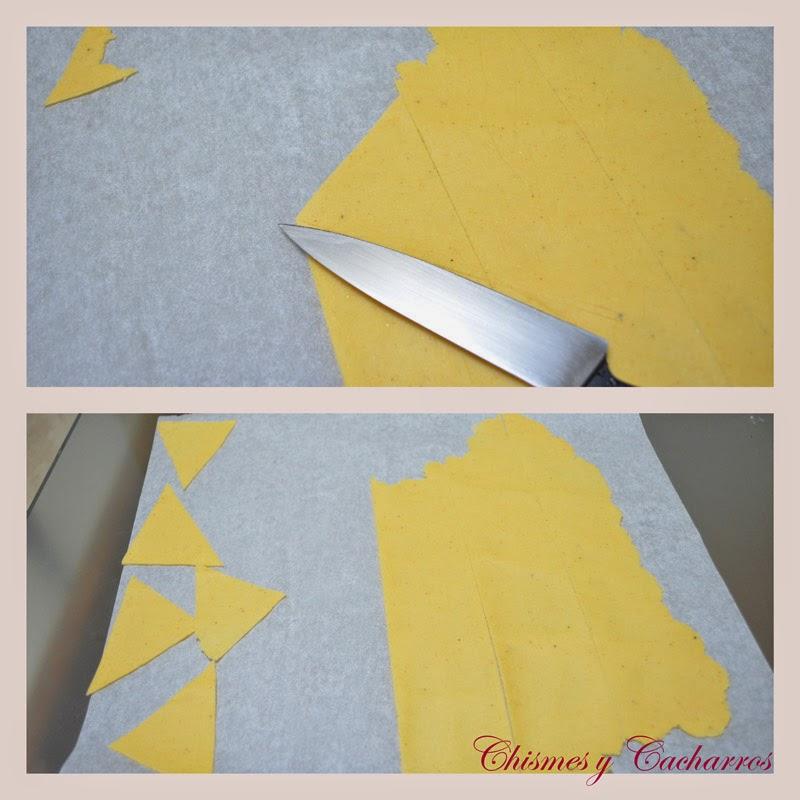 Coger un trozo de masa y ponerla entre dos plásticos estirar muy fino 1mm. Cortar en tiras de 4-5 mm de ancho y luego hacer triángulos para formar los nachos , calentar el horno a 220º arriba y abajo. Colocar en la bandeja del horno sobre papel de cocción. Meter al horno unos 10 minutos hasta que estén un poco dorados, yo también les di un toque con el grill. Pero es opcional.