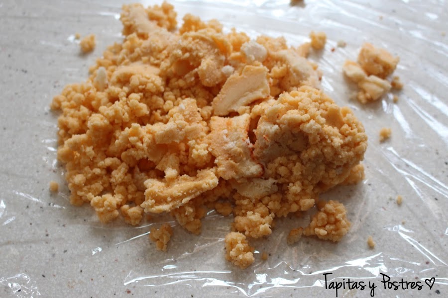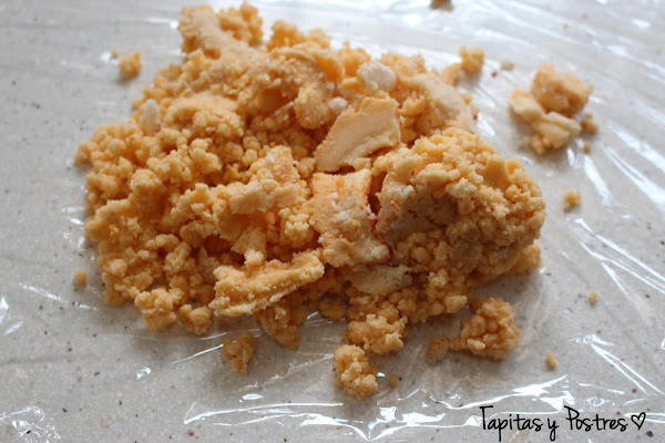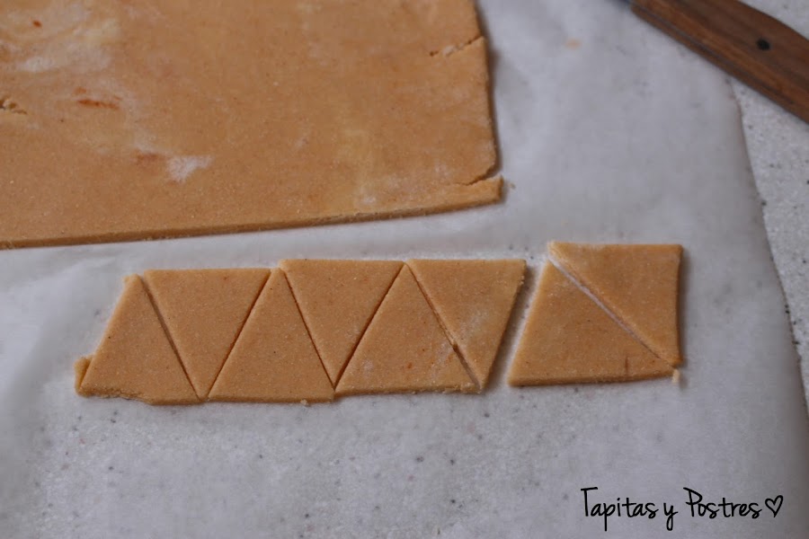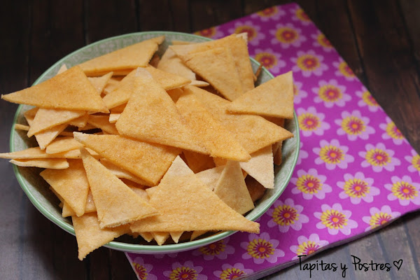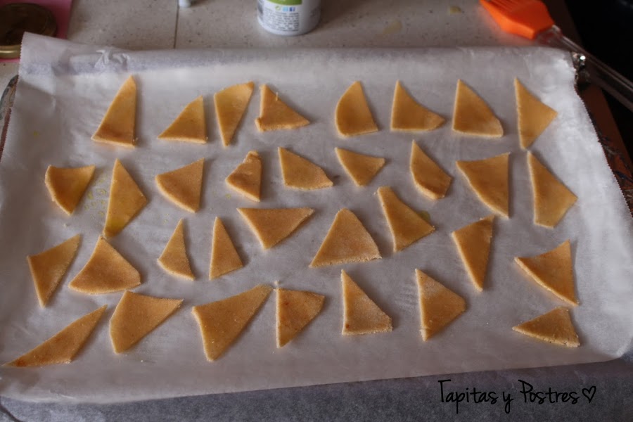 Estirar la masa sobre un papel vegetal, dejarla fina y cortar tiras anchas. De cada tira hacemos triángulos que ponemos en una bandeja de horno. Pintamos con un poco de aceite y horneamos a 180º unos diez minutos o hasta que veamos que empiezan a dorarse.