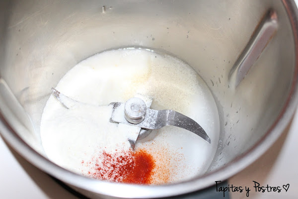 Poner en el vaso la harina, el agua, la sal, la pimienta y el pimentón, mezclar 30 segundos a velocidad 4 . Después amasar 2 minutos a velocidad espiga. Retirar la masa del vaso, guardar en una bolsa y dejar reposar 15 minutos.