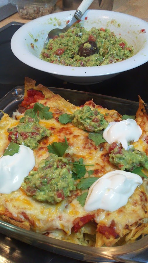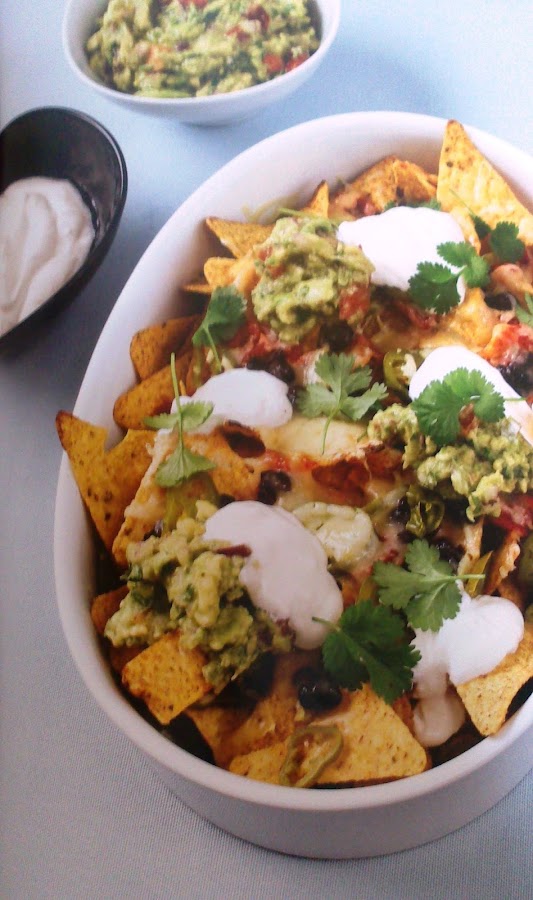 Horneamos los nachos 7 minutos o hasta que el queso se funda. Esparcemos más jalapeños y el resto de cilantro. Ponemos encima un poco de guacamole y de crema agria con una cuchara. Servimos el resto de acompañamiento.