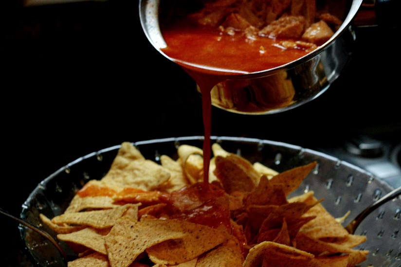 Cuando ya estén cocidas y el caldo reducido, sacamos el pollo y lo desmenuzamos. Seguimos, incorporamos nuevamente el pollo al caldo reducido y le agregamos el tomate, comino, pimienta y cilantro bastante picado. Dejamos cocer hasta que se reduzca un poco más?No ha de quedar muy espesa. Reservamos pero ha de estar caliente en el momento de ponerlo sobre los nachos