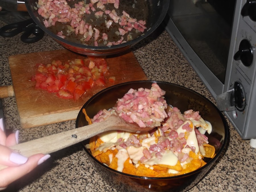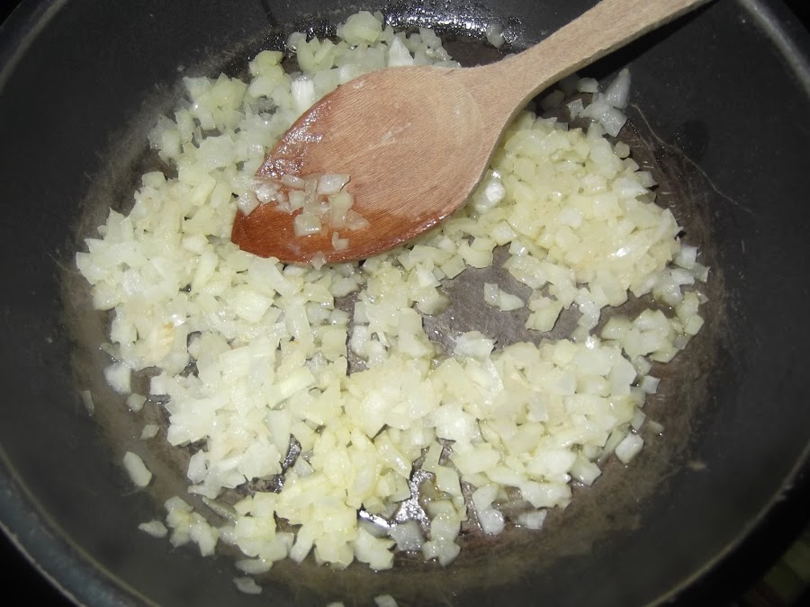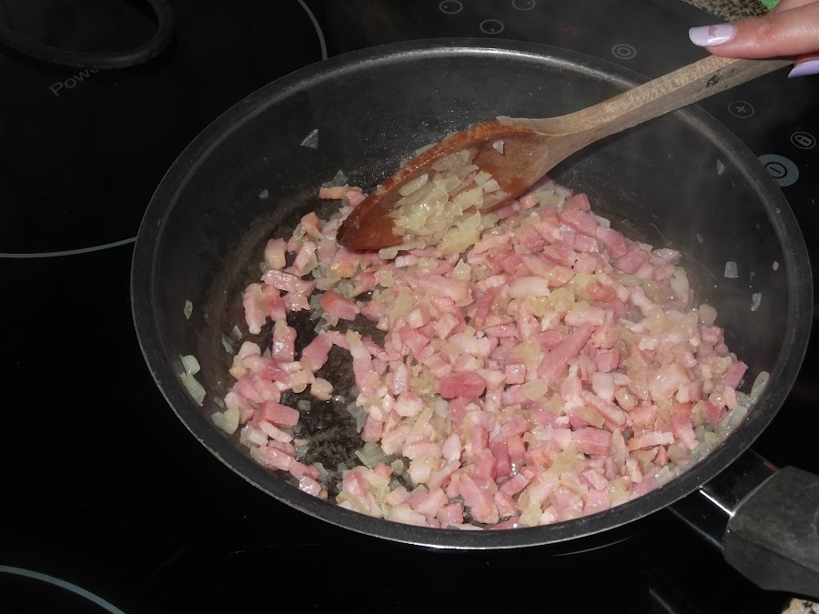 En primer lugar cortamos la cebolla en trozos muy pequeños. Añadimos en una sartén un poco de aceite y comenzamos a freirla. Cuando ya ha tomado un poco de color le añadimos el bacon también en trozos pequeños, aunque en este caso da un poco lo mismo.