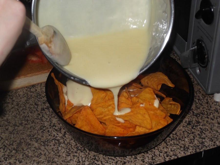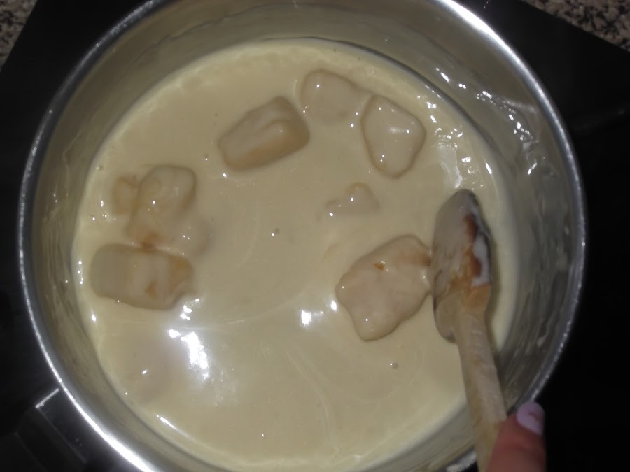 Una vez realizado el sofrito, le quitáis el aceite sobrante y lo reserváis. Ahora vamos a comenzar con el queso chedar, el cual lo cortamos en trozos y lo añadimos a un cazo con un poco de nata (crema de leche), lo vamos removiendo para que se vaya fundiendo y le añadimos el resto de la nata (crema de leche) hasta que nos queda una salsa homogénea. Con estas cantidades sabe bastante a queso, aunque como no es un queso muy fuerte no importa, aunque también le podéis añadir nata (crema de leche) para rebajar un poco su sabor.