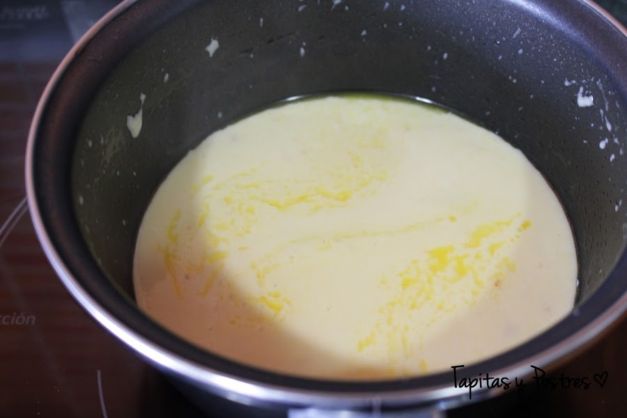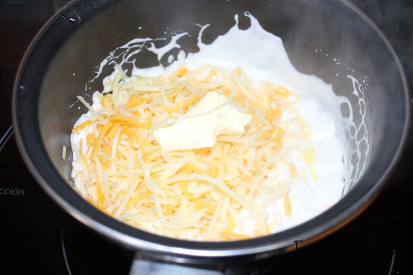 Vamos con la salsa de quesos, ponemos todos los ingredientes en un cazo y calentamos a fuego suave.