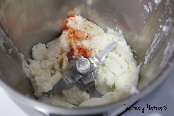 Poner en el vaso de la thermomix la harina, agua, aceite, sal, pimentón y ajo en polvo. Mezclar 15 segundos a velocidad 4 y luego amasar dos minutos a velocidad espiga. Sacar del vaso (estará como si fueran migas), hacer una bola y dejar reposar 15 minutos). Podemos hacer la masa sin thermomix. En un bol ponemos la harina, sal, ajo en polvo y pimentón. Mezclamos un poco y añadimos el aceite. Revolvemos y vamos añadiendo el agua y amasando hasta tener una masa homogénea y nada pegajosa.