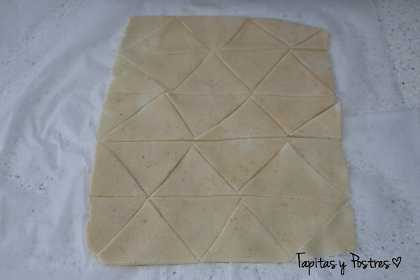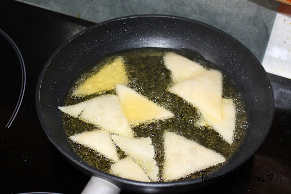 Estirar entre dos papeles vegetales y hacer un rectángulo (cortamos los filos para que nos quede recto). Con un cortapizza hacer triangulitos. calentar aceite en una sartçen y cuando esté bien caliente freír los triángulos hasta que cambian de textura y veis que le salen unas burbujas y se hinchan ligeramente. No los dejéis tostarse mucho, se pondrían muy duros.
