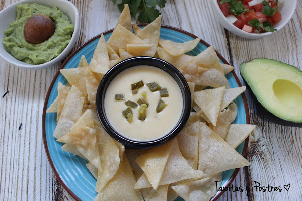 Y ya tenemos nuestro picoteo mejicano, con tres salsas distintas a elegir. Podemos añadir a la salsa de queso unos trocitos de jalapeños para darle un toque picante.