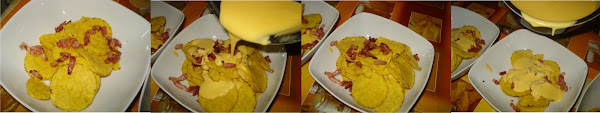 Ya tenemos todo, ahora solo falta servir. Sobre parte de los nachos ponemos un poco de bacon y encima un poco de la salsa, de nuevo un poco mas de nachos, bacon y la salsa y a comer.