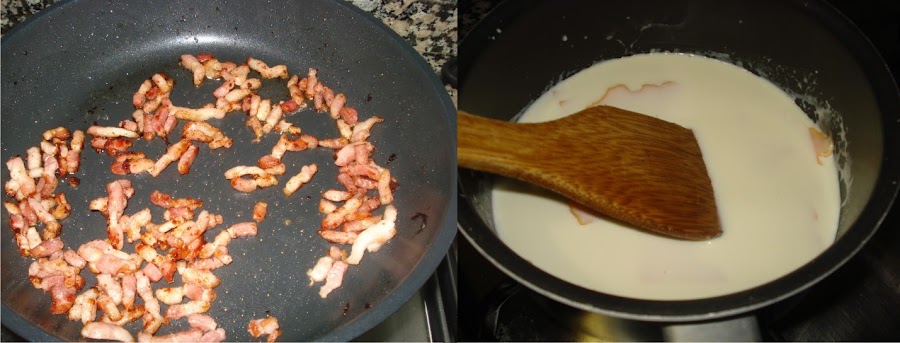 Poner al fuego un recipiente con la nata (crema de leche) y el queso troceados. Remover continuamente hasta que se funda el queso pero intentando que no llegue a hervir.