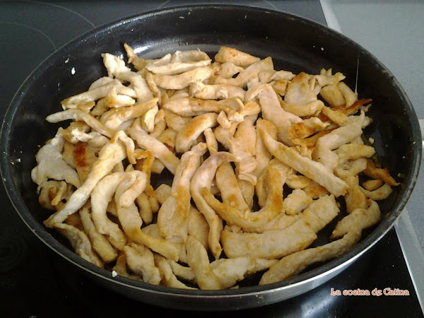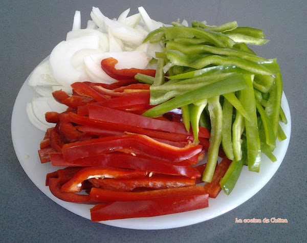 Cortamos las verduras en tiras y los filetes de pechugas también en tiras.