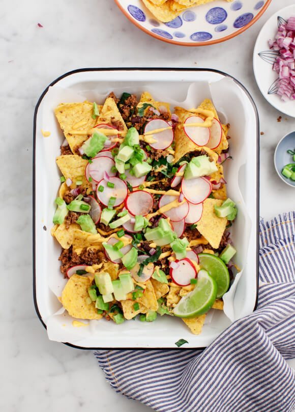 Ensamble los nachos: en una fuente grande, coloque la mitad de las tortillas en una sola capa, cubra con ¾ del taco "carne", la col rizada, la mitad de los cebollines y la mitad de la crema de calabaza. Agregue otra capa de chips y cubra con la carne de taco restante, la crema de anacardo restante, los rábanos, el aguacate, las cebolletas restantes, la cebolla roja en cubos y el cilantro. Cubra con un chorrito de jugo de lima y sirva con las rodajas de lima restantes.