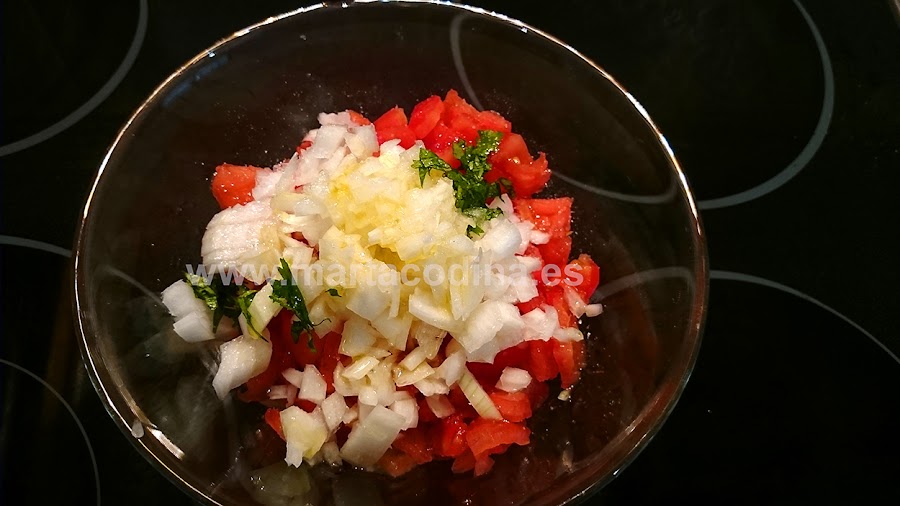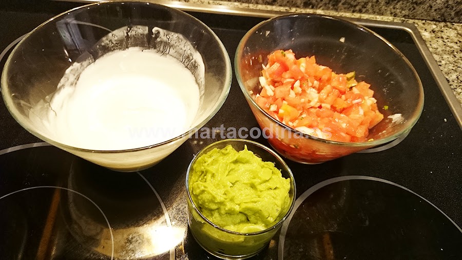 Empezamos por el pico de gallo: pelamos los tomates, sacamos semillas y cortamos a dados pequeños. La cebolleta igual. Añadimos las hojas picadas del cilantro, una pizca de sal, la lima y un chorrito de aceite, muy poco. Mezclamos y reservamos en refrigerador.