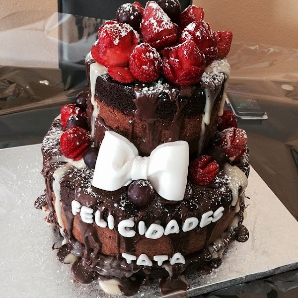 Yo he preparado para el cumpleaños de "Tata", un bizcocho de dos pisos en el cual intercalé bizcochos de chocolate y vainilla. Para el relleno, utilicé chocolate blanco y delicioso chocolate de leche milka. Para decorar, utilicé fresas cortadas en forma de flores y en el contorno algunas fresas y uvas, una rociada de azúcar glas y un lazo blanco.