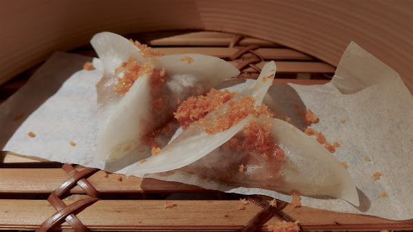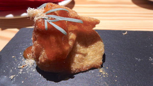 Ambos deliciosos, con una masa muy fina que recubre dos rellenos muy sabrosos. El de cerdo y cebolla está nevado con corteza de cerdo a modo de polvo y el de papada tiene un sabor muy potente.