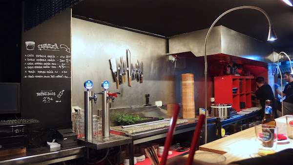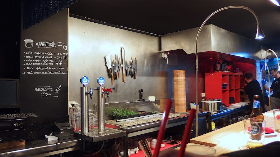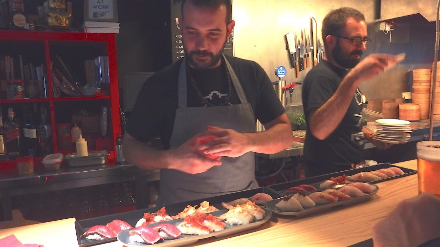 Una vez dentro te encuentras una gran barra, con capacidad para doce comensales, y un par de mesas altas. Si lo que buscáis es una cena cómoda en mesas con mantel este no es vuestro sitio, en Nakeima se come con palillos o con las manos, sentado en un taburete en la barra, viendo como preparan los nigiris y como terminan los platos, disfrutando de la conversación con el personal del local y la buena selección musical que se escucha de fondo.