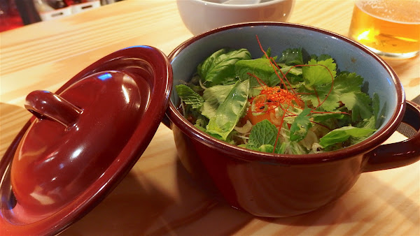El wonton se acompañaba con una salsa picante y alga ramallo de mar, si no me equivoco, que le da un sabor marino muy potente. Un bocado crujiente y lleno de sabor.