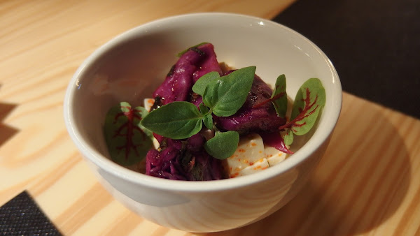 Como plato de presentación, para que se haga más agradable la espera hasta que comienzan a servirte las elaboraciones que has elegido, un pequeño aperitivo, en nuestro caso kimchi de lombarda con tofu.