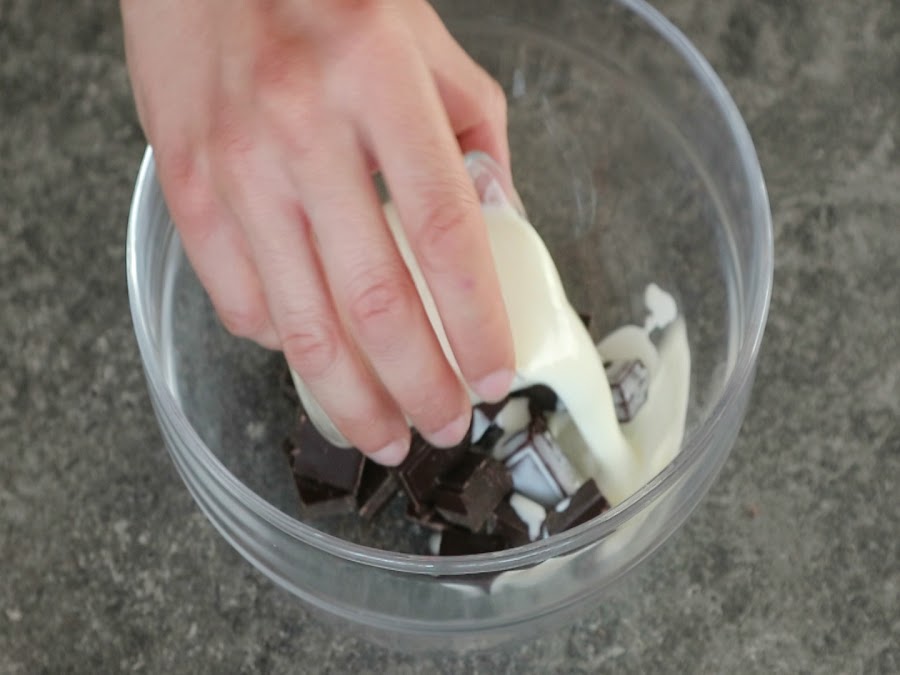 Lo primero que haremos es trocear el chocolate por la mitad para que nos sea mas facil derretirlo con la nata (crema de leche) líquida. La nata (crema de leche) líquida la calentamos en el microondas durante 40 seg. Al sacarla hay que tener mucho cuidado de no quemarnos.