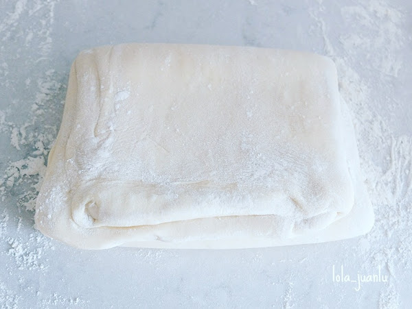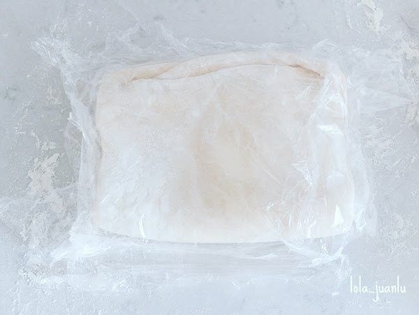 Es decir, una vez que tenemos la masa estirada, la doblamos, llevando un extremo hacia el centro y el otro extremo hacia el final, de manera que cubra la parte de masa anterior. Tapamos con film y dejamos reposar durante 15 minutos.