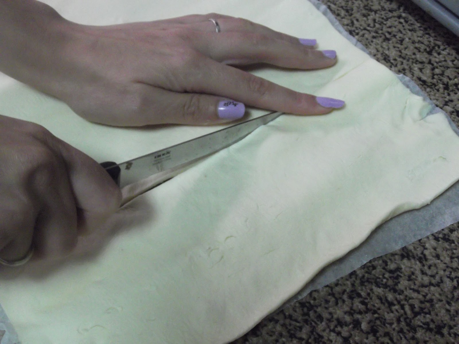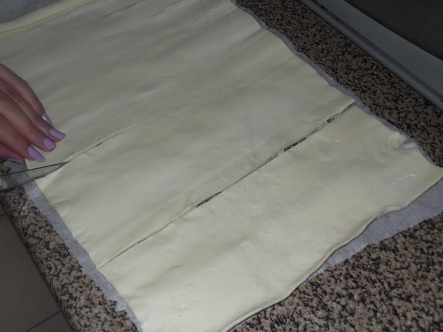 Nuestro primer paso será extender la masa de hojaldre y echar un poco de azúcar glass. Cortamos la masa en tres franjas verticales, aunque eso dependerá del tamaño de la masa que utilicéis, en mi caso era del supermercado Lidl, que salen bastante económicas de precio y están muy buenas.