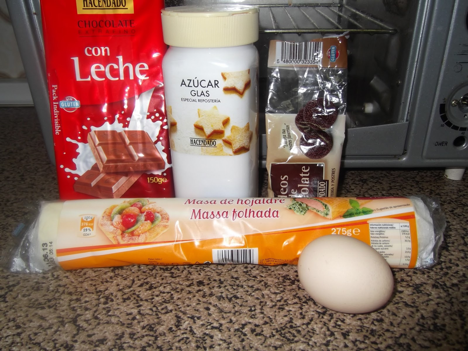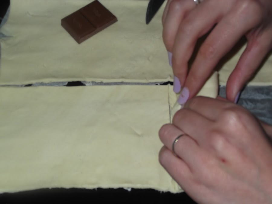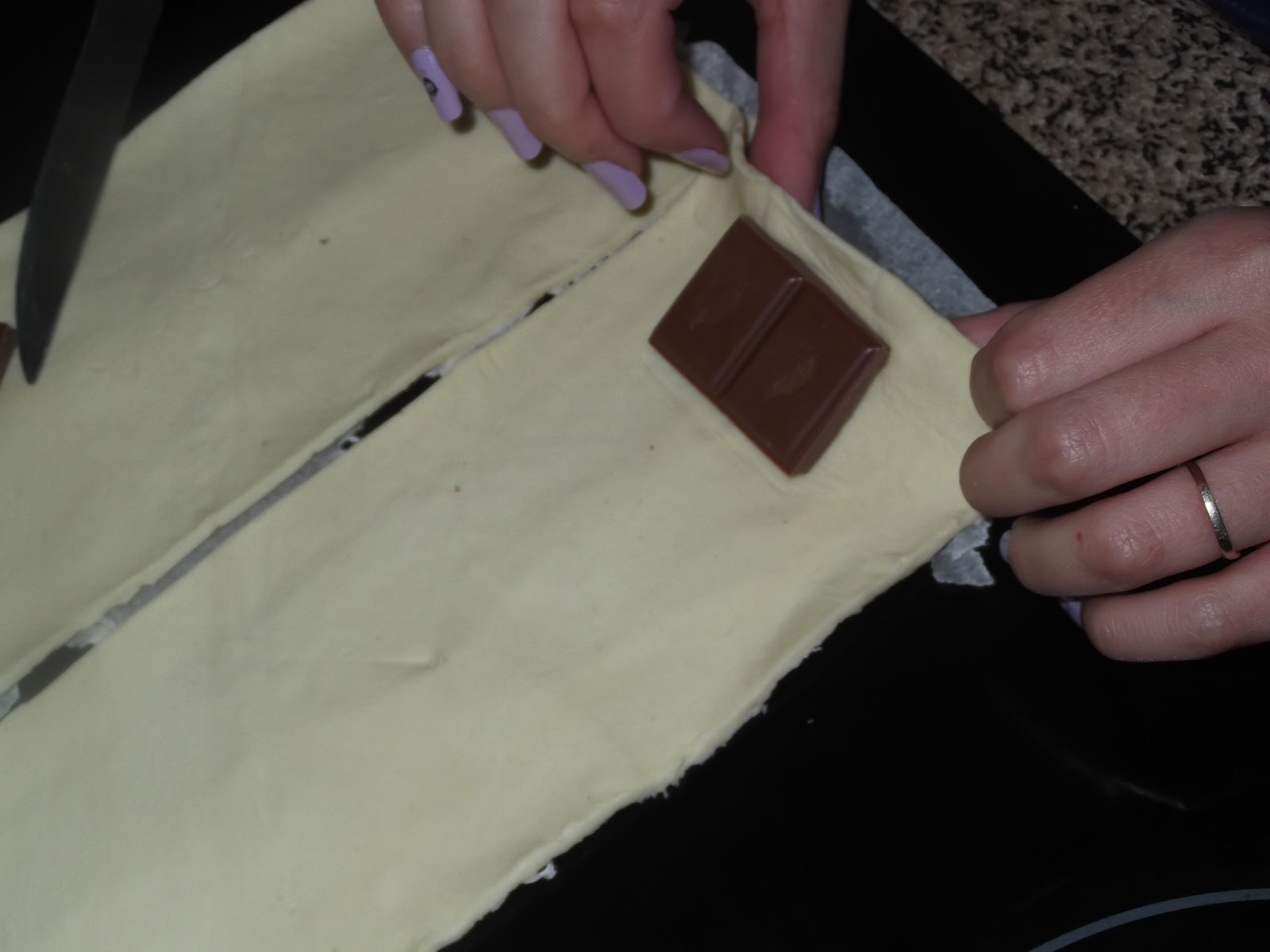 Ahora cortamos cada una de las franjas en cuadrados y metemos en cada una de ellas dos onzas de chocolate con leche, podéis también utilizar chocolate para postres o chocolate negro, pero con éste último me resultan demasiado fuertes. Vamos cerrando cada uno de los cuadrados y las colocamos en la bandeja del horno en la que habremos puesto papel para que no se nos peguen. Eso sí no las pongáis muy juntas, ya que en el horno crecen un poco.