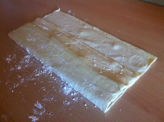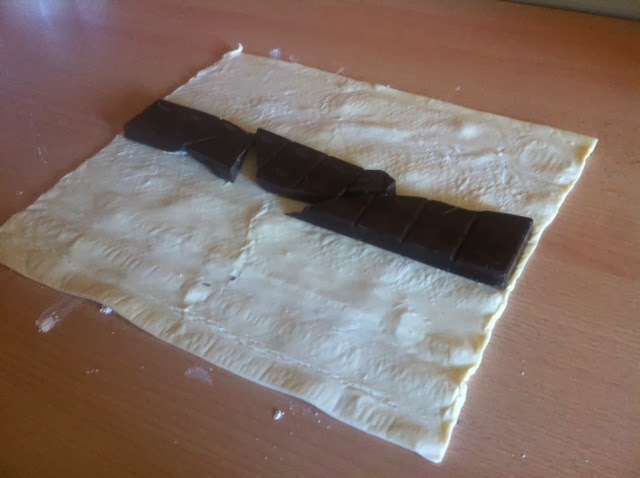 Colocar en el centro el chocolate a lo largo en porciones de 2 onzas de ancho aproximadamente y cerrar según indicaciones de las fotografías (los laterales hacia el centro).