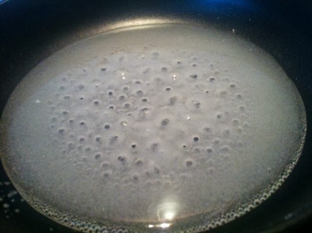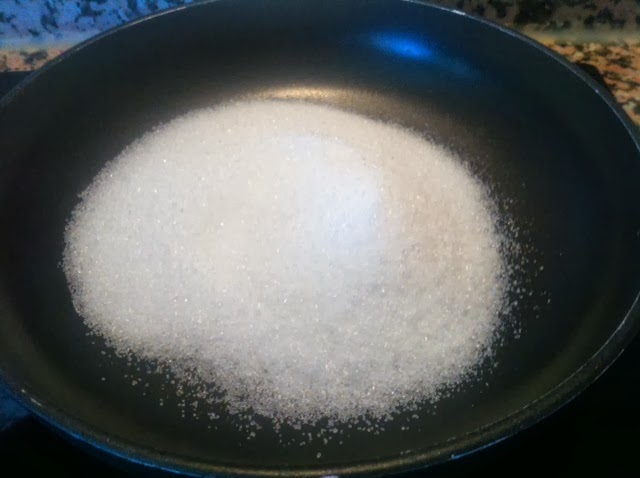 Ahora en una sartén pequeña poner 100 grs de azúcar (4 cucharadas) y 30 ml de agua y cocinar sin remover hasta que se disuelva el azúcar en el agua.
