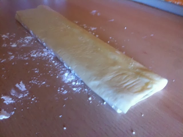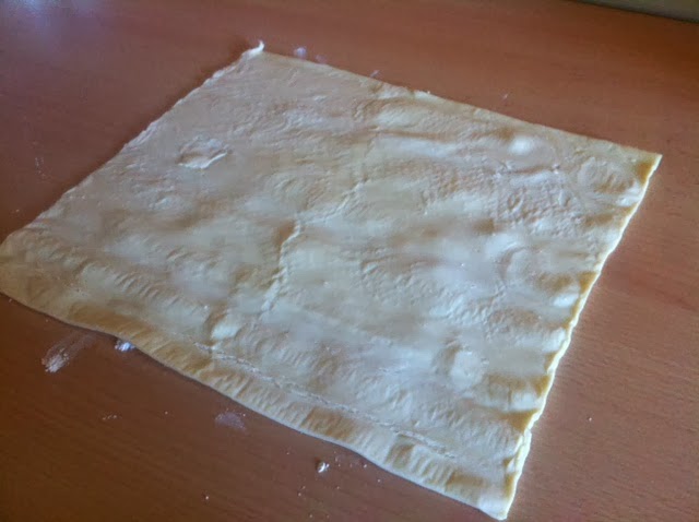 Mientras, en la encimera bien limpia, echar una cucharadas de azúcar glass y poner encima la plancha de hojaldre.