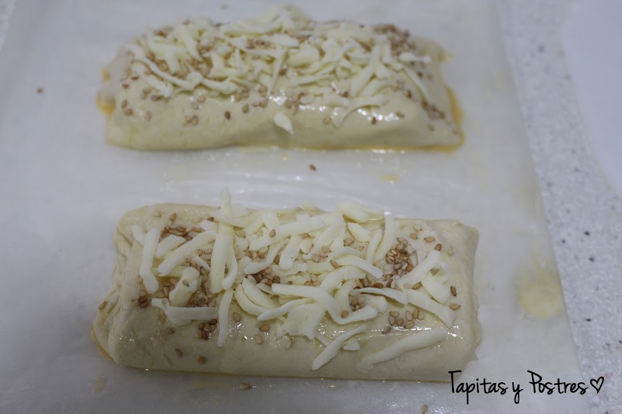 Pintamos de huevo batido, espolvoreamos queso rallado y sésamos encima. Al horno.