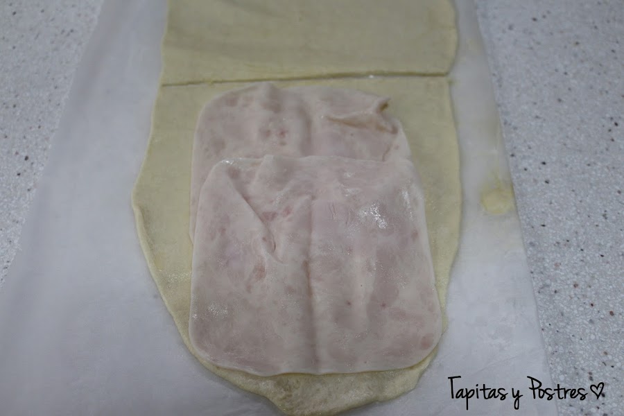 Extendemos el hojaldre y cortamos porciones de tamaño cuadrado, aproximadamente.